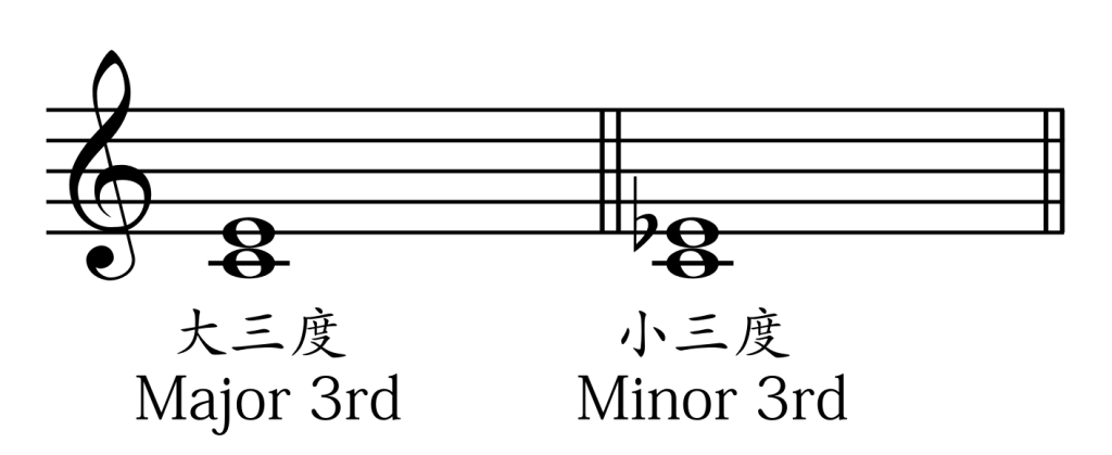 大三度音程在泛音列中位於第五個音,也是較為和諧的音程。大三度能帶給聽者較光亮的感覺,小三度則稍微憂愁一些。